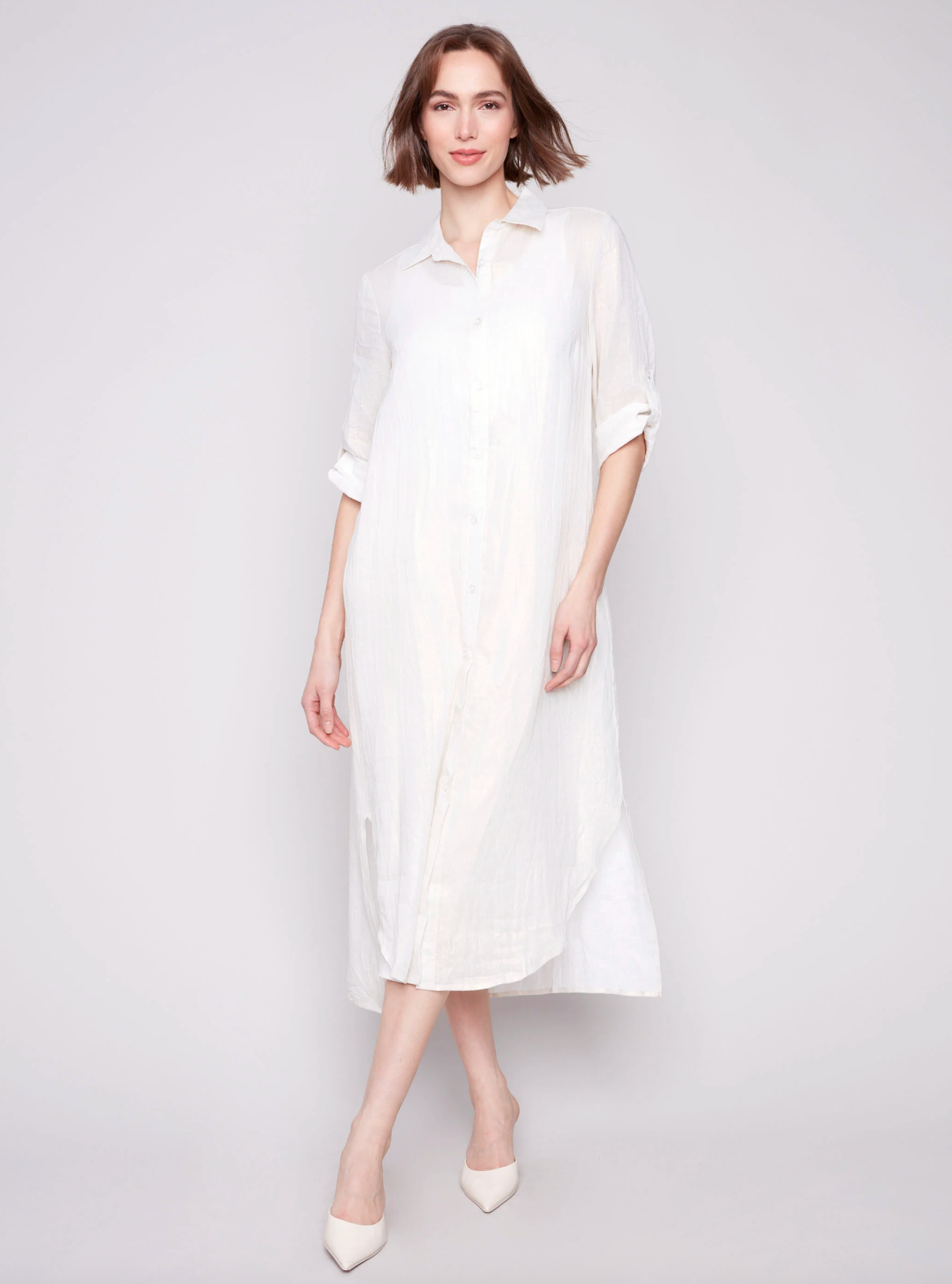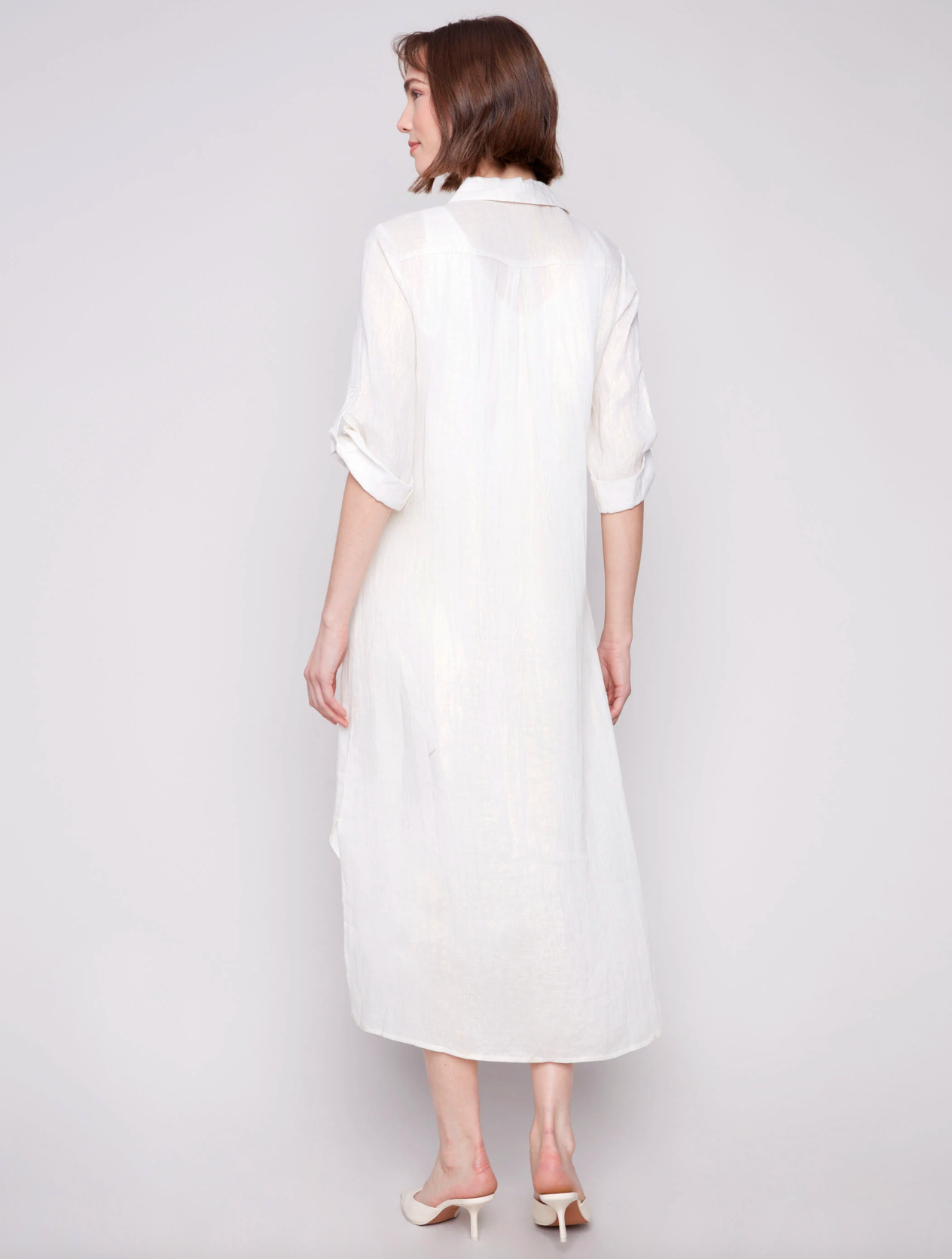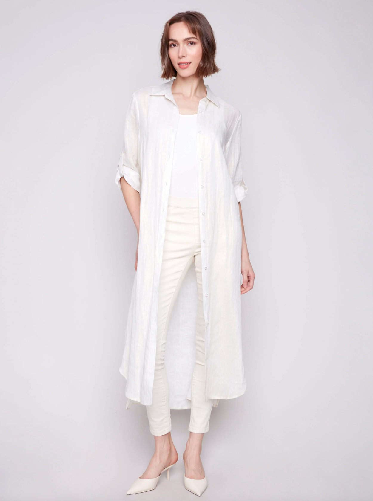 Boost your fashion sense with this fashionable foil print linen blend tunic dress by Charlie B in a champagne white shade. Crafted from a breathable blend of cotton and linen, it a shiny foil print finish, a button front design, and 3/4 sleeves that can be rolled up. Ideal for any spring and summer occasions, it effortlessly blends comfort with style.