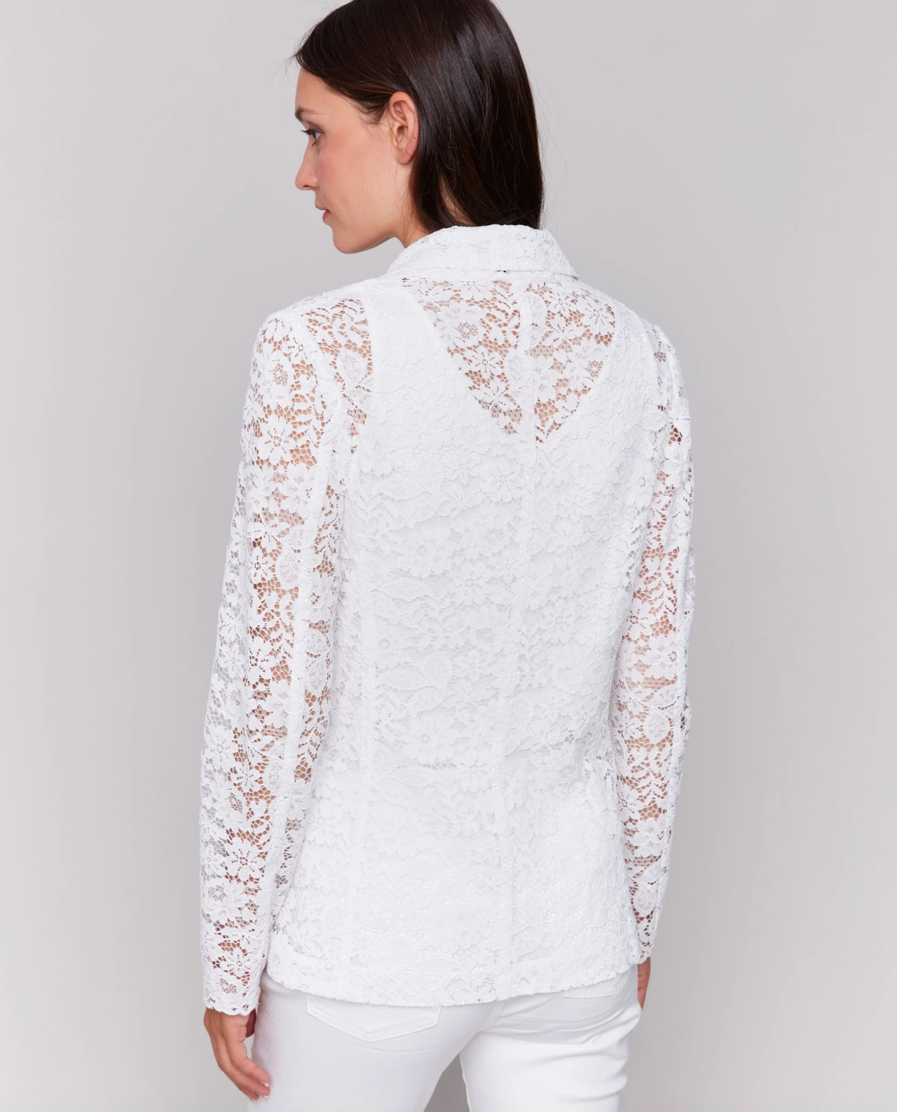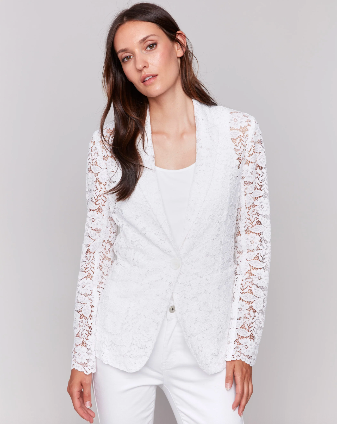 Embrace true elegance this spring and this summer with this beautiful white lace blazer. The intricate lace detailing, without any lining, adds a touch of refinement to your wardrobe. It's perfect for a sophisticated brunch or a stylish night out, and features a button closure and convenient front pockets for both practicality and fashion.