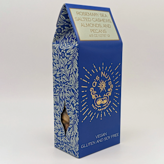 Each 4.5oz box contains a delightful mix of nuts, seasoned with a hint of rosemary and sea salt. This blend, inspired by our love for good food and passion for kitchen creativity, ensures a fresh and high-quality snack. They are sugar-free and prepared without any preservatives, making them a healthy choice. Packaged in recyclable material, these nuts can be enjoyed year-round and remain shelf-stable for 6-12 months. Please note, they contain tree nuts.