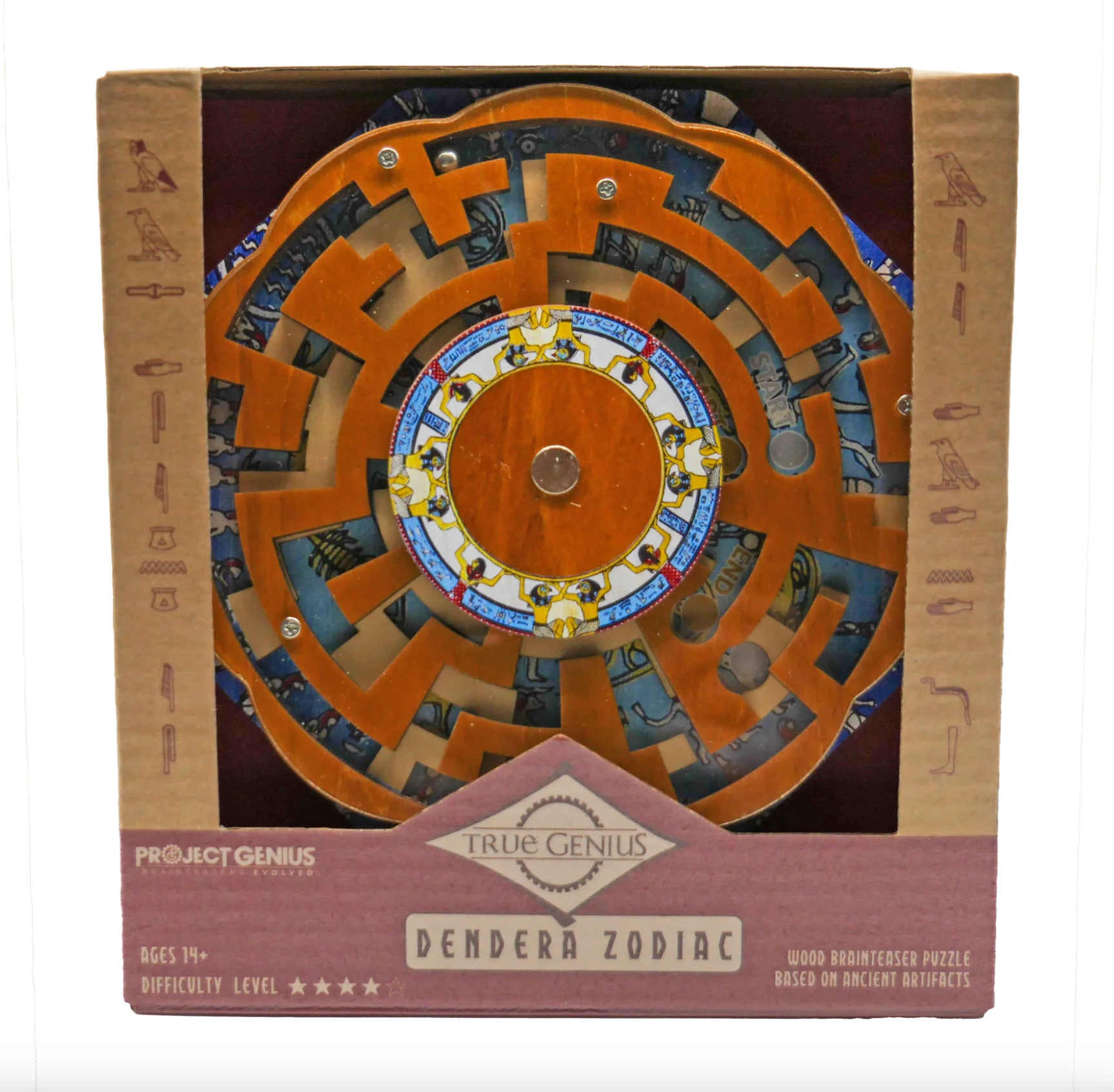 To solve the Dendera, you will twist the top layer of the maze to open new pathways for both of the ball bearings to navigate from their respective start-to-finish paths through the constellations of the ancient night sky. Recommended for ages 14 years and older.