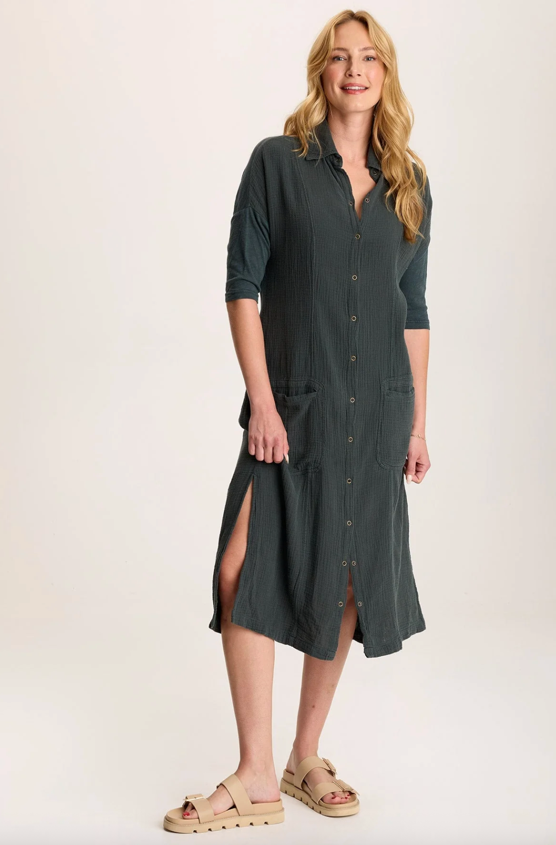 Wear as a dress or throw over as a light outer layer, the Hogue Cover-Up by XCVI is made in our plush double gauze and is a three-quarter sleeve midi duster with ample versatility and flare. Featuring snap-down detail, a classic collar, and cheeky slits at the side hem, This garment has been preshrunk for the best fit and is machine washable!