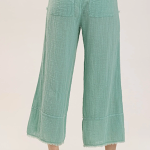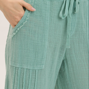 This wide-leg cocoon gauze crop by XCVI features pin tuck details on leg front, front and back pockets, raw edge details on hem and pockets, and a drawstring waistband.