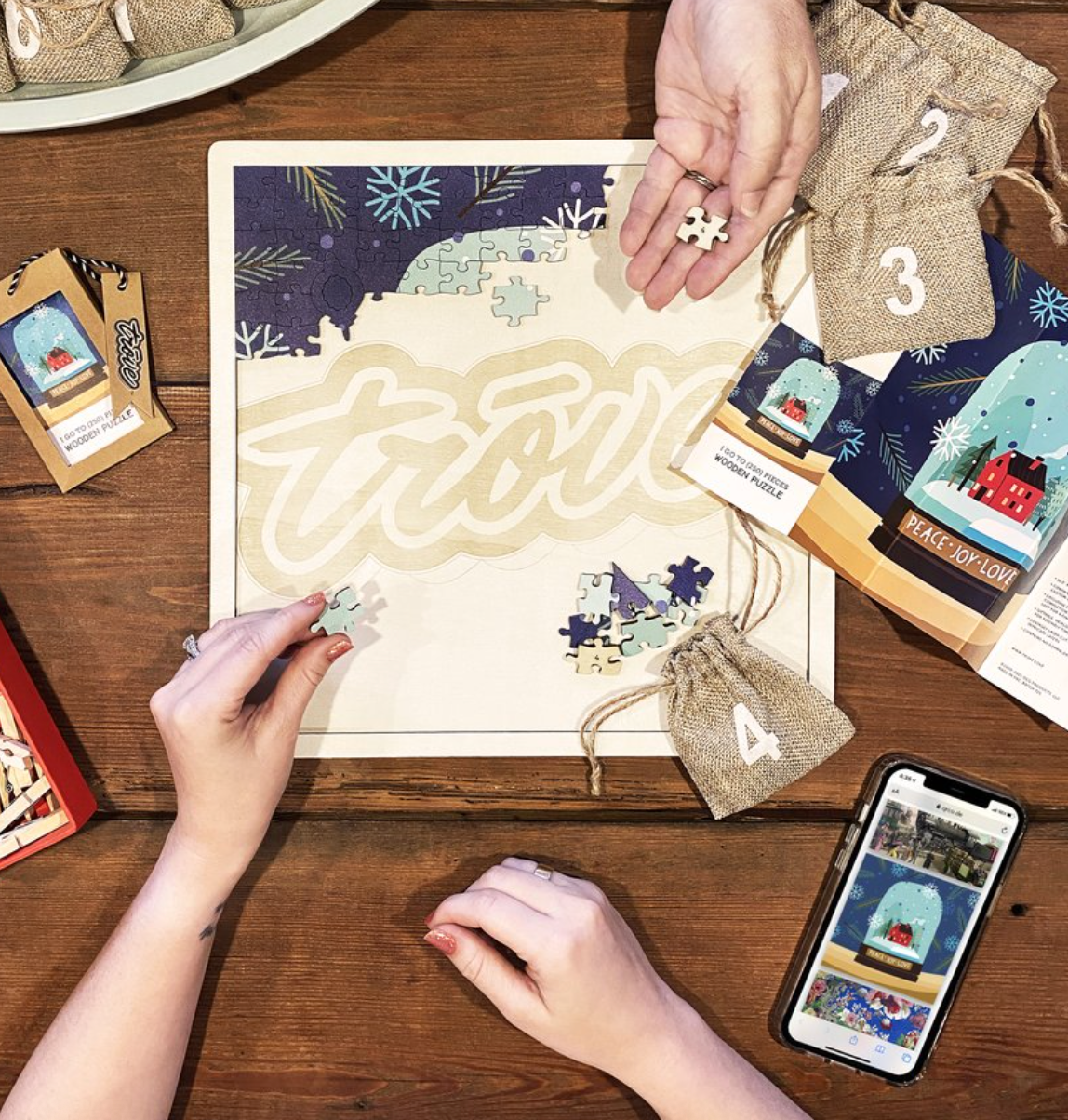 The wooden Puzzle Pallet by Trove makes puzzle-putting-together contained and portable. Want to start in the kitchen but later move to the office? Here ya go. • Every Trove puzzle assembles perfectly in the 11.5" square framed area. Outer frame measures 12.5" square. • The perfect add-on when gifting a puzzle (to others or yourself!) or to make puzzling more enjoyable